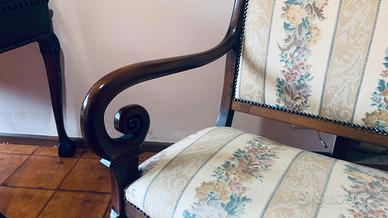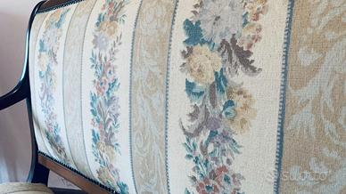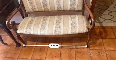Elegante divanetto a due posti in legno, risalente ai primi del ‘900. Struttura con braccioli sagomati a ricciolo e gambe slanciate. Rivestimento in tessuto floreale. Ideale come complemento d’arredo per ingresso, camera o studio. Condizioni buone e struttura solida. Dimensioni: Larghezza: ~115 cm Non effettuo spedizione né smontaggio: trasporto a carico dell’acquirente.