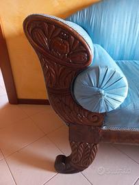 divanetto antico in legno e rivestimento in seta azzurra. Il rivestimento ha piccoli segni di usura solamente sulla seduta. Dimensioni 203 cm x 68 Trasporto a cura del compratore