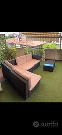 Vendo divanetto in rattan da esterno con cuscini sotto per la seduta e per la schiena tenuta bene sempre coperti. Con tavolino in vetro