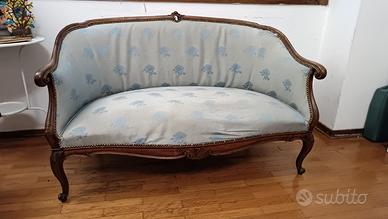 Vendo divanetto antico da 2 posti con 2 poltrone e 2 poggiapiedi da restaurare. Ritiro a cura del compratore.