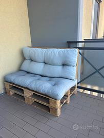 Vendo divano da esterno fatto con pallet. Inclusi anche i cuscini, anche se usurati dall’esposizione al sole. Ritiro di persona.