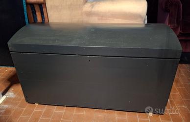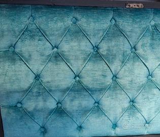 Divanetto capitonne' in velluto di lino, brillante colore verde azzurro, ricavato dal baule della nonna, riverniciato in grigio antracite, con seduta alzabile per il contenitore. Conserva serratura e maniglie laterali. Misure cm 103x53x45H . Modifiche e imbottitura sono nuove, il baule chiaramente no, era della nonna, anche se intatto e ben conservato.