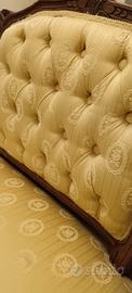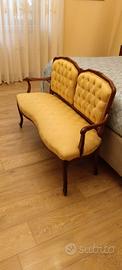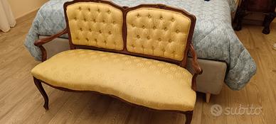 Divanetto in stile Luigi XV da restaurare ma in buono stato strutturale. Tessuto in oro e schienale a scudo con lavorazione in capitonne'. Comodo per due persone. Larghezza 120 cm altezza 82. Ideale per sala o da camera da letto. Ritiro sul posto. No spedizione. Prezzo non trattabile.