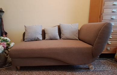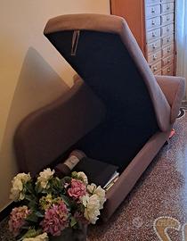 Divanetto dormeuse con contenitore integrato, sponda reclinabile 90°sx, tessuto colore tortora, piedini in legno