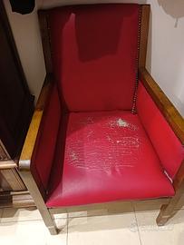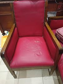 Divanetto, due poltrone, due sedie anni 40 in buono stato, simil pelle rossa, borchiato con finiture in legno.