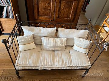 Divanetto in ferro battuto, 2 posti. Dimensioni 66x126cm Come nuovo, comprensivo di materassino e cuscini tinta sabbia