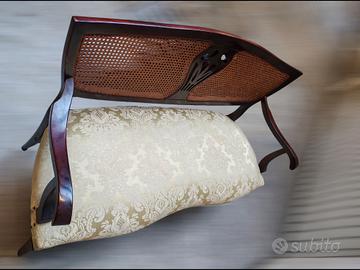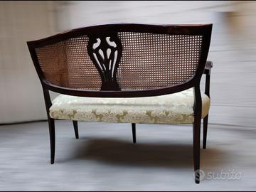 Divanetto in stile inglese in vero legno di mogano con seduta Imbottita con tessuto damascato di colore verde salvia