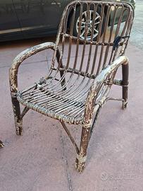 Divanetto in Vimini, usato e con lavoretti di manutenzione spicciola da fare (vedi dalle foto). Comunque funzionante, non si cade a terra, ed usabilissimo anche così com'è. Non inclusi nelle foto, ma inclusi nella vendita, cuscini per tutte le sedute ed il divanetto, su misura, che lo rendono davvero comodo per caffè all'aperto d'estate, in giardino oppure in veranda.