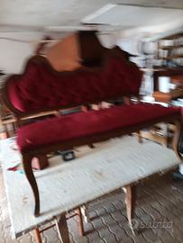 divanetto in legno con imbottitura velluto rosso restaurato di recente leggermente lacerato in un angolo.