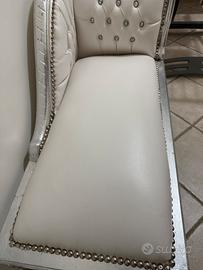 Caratterizzara da un design asimmetrico e finiture di lusso. La struttura in legno é in goglia argento ed è intagliata con motivi a riccio.Il rivestimento in ecopelle bianca ( schienale e bracciolo) impreziositi con bottoni in swaroski.