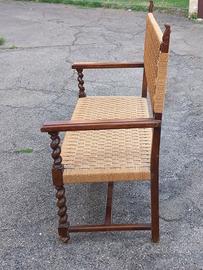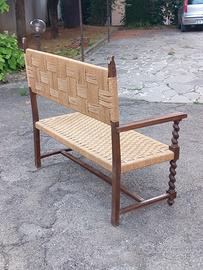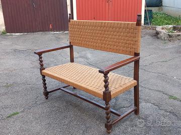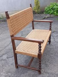 Divanetto rustico (anni '50 circa) in stile contadino con dettagli torniti che richiamano il gusto barocco. Legno massello e seduta di corda intrecciata. Ottimo stato di conservazione.