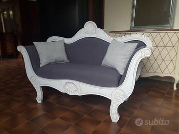 Divanetto art. 2170S da sala d'aspetto nuovo in finitura laccata bianco Shabby imbottito in stoffa grezza con cuscinetti bicolore cm. 150*53*100 H prezzo in stock per eliminazione catalogo, prezzo netto franco nostri magazzini