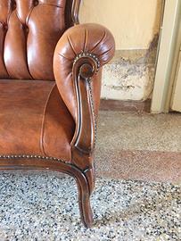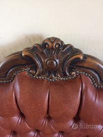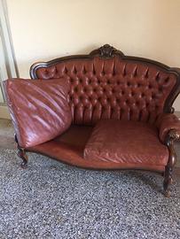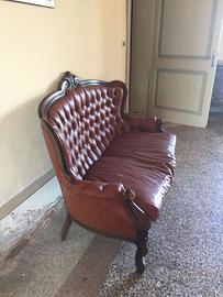 Divanetto imbotttito stile classico schienale capitonè in similpelle. Con due cuscini di seduta imbottiti. Struttura in legno con bracciolo tornito. Dimensioni. Lunghezza 150 cm. profondità 82 e altezza schienale 109 cm.