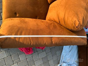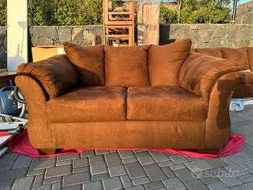 Divani in tessuto scamosciato marrone, uno da 2 posti e uno da 3 posti. Non sfoderabili. Misure divano 2 posti: altezza 82 cm, profondità 90 cm, larghezza 160 cm. Misure divano 3 posti: altezza 82 cm, profondità 90 cm, larghezza 210 cm. Vendibili anche singolarmente.