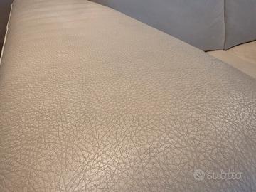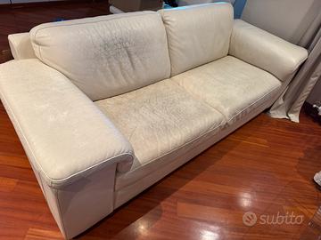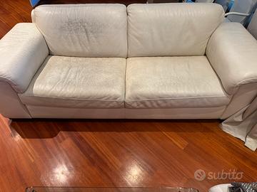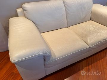 Coppia divani a 2 e 3 posti, in pelle color crema chiaro. Il materiale utilizzato per il rivestimento é la prima scelta proposta dall’azienda. Piedini in legno scuro. Alcuni segni di usura superficiale, che rendono però i divani ancora più belli. Marca Divani & Divani by Natuzzi.