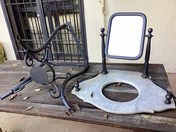 toilette antica con ripiano in marmo completa di brocca e ciotola in ceramica non presenti in foto. specchio e struttura in ferro battuto con porta asciugamani laterali.