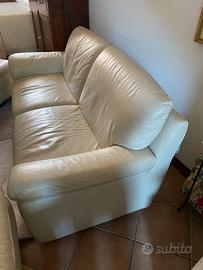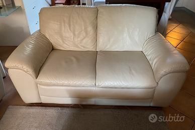 Vendo 2 divani in abbinata, uno da 2 posti con seguenti misure, larghezza 160cm, profondità 90cm, altezza 90cm. Uno da 3 posti con letto da una piazza e mezza estraibile con seguenti misure, larghezza 194cm, profondità 90cm, altezza 90cm (misure letto, 180x125cm). Entrambi in buone condizioni, color panna/beige, in vera pelle. Ritiro da fine Giugno.