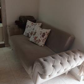 bellissimi divani in scamosciato ciniglia colore tortora 3 posti e 2 posti entrambi si aprono a divano letto e hanno cassettiera sotto porta coperte struttura in legno, corredati da 7 cuscini, l'unico Piccolo difetto spalla sx del due posti un po' incrinata a causa della rottura del legno interno ma riparabile. nuovi costano scontati 1.500€.
