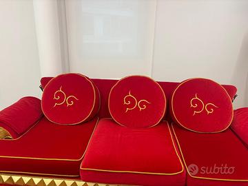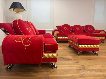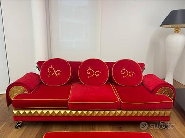 • Dettagli: L'elemento distintivo è la fascia decorativa con borchie a piramide in finitura oro lucido e i piedini laccati neri con intarsi dorati. I cuscini e i braccioli rifiniti con passamaneria e ricami dorati completano il look sontuoso.