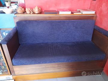 Divano a due posti in tessuto vellutato di colore blu notte, con cuscini. Secondo divano a seduta corta "cassettonato" in legno, medesimo colore con scompartimento posteriore. Due poltrone della medesima fattura dei divani e ampia seduta. Ogni pezzo è sfoderabile.
