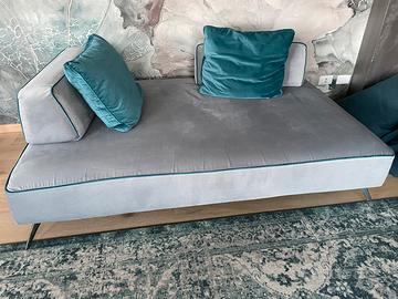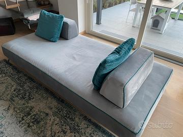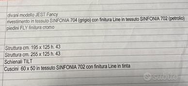 Causa cambio, vendo due divani di design abbinati con possibili di valutazione vendita anche singolarmente. Misure 255 x 125 cm e 195 x 125 cm con h per entrambi di 43 cm. Gli schienali sono completamente spostabili sul divano stesso nella posizione preferita nonché rimovibili. Il divano è dotato inoltre di 8 cuscini abbinati. Colore grigio con finitura color petrolio. Visionabile senza alcun problema. Astenersi con proposte perditempo, grazie!