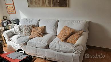 2 divani a due e tre posti. Sono datati e il fondo si è lasciato un po' andare, ma comodi e belli. In regalo anche le fodere bianche di ricambio. Da sistemare un bracciolo del divano a due posti nella parte di struttura in legno da saldare con due chiodi. Se interessa sono da portare via così come sono, non smontabili.