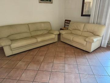 Due divani in pelle chiara in buone condizioni strutturali e devono solamente essere pulito con il latte detergente. Hanno le seguenti misure: 200 cm di lunghezza per 90 cm di altezza e 160 cm di lunghezza per 90 cm di altezza.