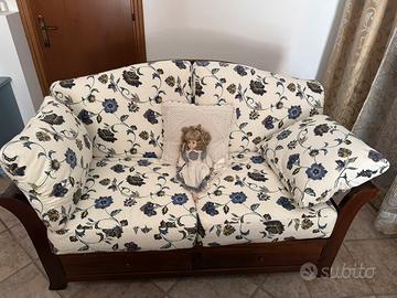 Due divani letto in legno con seduta in stoffa, come nuovi.