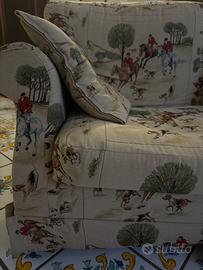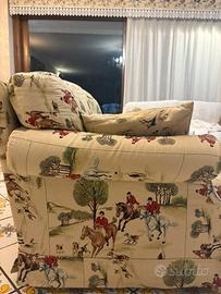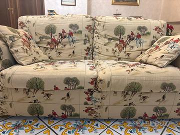 Vendesi n. 3 divani 2 posti, di cui uno letto, in piuma d'oca sfoderabili in ottime condizioni, completi di tre cuscini., fantasia inglese cavalli caccia alla volpe, vendibili anche singolarmente a € 200, € 200 e € 250.