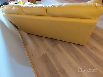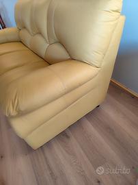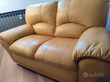Composto da un divano a 2 posti e uno a 3 posti in vera pelle, di colore senape elegante e caldo.