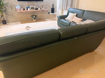 Vendo due divani in vera pelle , condizioni ottime , non presentano ne graffi ne segni del tempo , con piedini in legno , due e tre posti , seduta molto profonda e comoda , colore verde foglia. Si vendono anche singolarmente. Trasporto a carico dell acquirente.