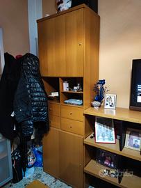 Due divani letto, porta TV, libreria, mobili con cassetti e vetrinetta