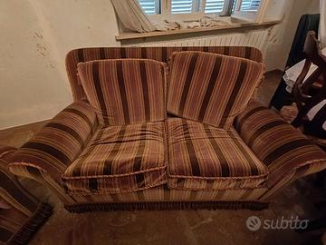 divano classico a due posti, in ottimo stato. Rivestito in tessuto a righe marroni e beige, si adatta perfettamente ad ambienti tradizionali.