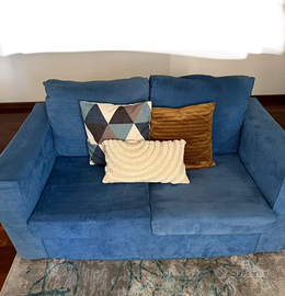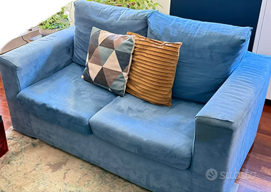 Vendo coppia di divani I due divani hanno rivestimento alcantara sfoderabile Colore blu Misure circa: imensione 158x98 cm sfoderabili Altezza al bracciolo 62 cm, schiena 82 cm