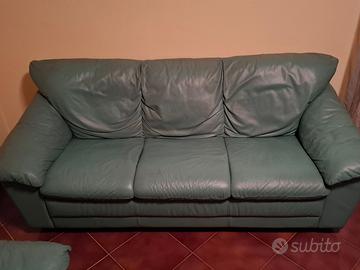 Vendo copia di divani, materiale simil pelle, colore verde, in buone condizioni come da immagini. Articolo composta da divano 3 porti, lunghezza 200 cm, e da divano 2 posti, lunghezza 150 cm. Non vendo separatamente. Non spedisco.