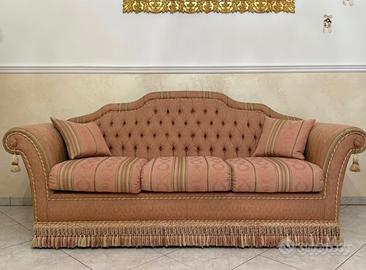 Descrizione: Vendo set completo di divani composto da un 2 posti e un 3 posti, in stile classico ed entrambi in eccellenti condizioni. Rivestimento in tessuto damascato color salmone/oro, schienale capitonné e finiture di pregio con cordone e frange decorative. Completi di cuscini coordinati. Nessuna macchia, nessun cedimento, nessun difetto. Perfetti per salotto elegante, casa vacanze, B&B o ufficio di rappresentanza. Molto più belli dal vivo. Caratteristiche: •Set: divano 2 posti + divano 3 posti •Tessuto damascato di qualità •Schienale capitonné •Braccioli arrotondati con passamaneria •Completi di cuscini •Condizioni eccellenti •Sempre tenuti con cura •Disponibili da subito •Ritiro facile (piano terra) Prezzo: € 250 trattabili Vendo per cambio arredo. per chi