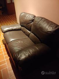 Due divani da 2 posti in vera pelle marrone. Presentano dei difetti come piccole macchioline sulla parte dietro i divani.