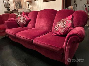 Coppia di divani in velluto rosso cardinale vintage a tre posti con quattro poltrone risalente agli anni '40 / '50 : linee sinuose con braccioli arrotolati , schienali sagomati a forma di conchiglia .