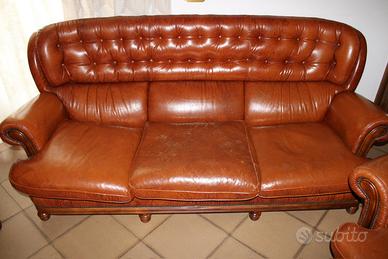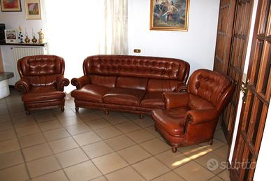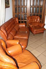 Set completo composto da divano 3 posti e 2 poltrone in vera pelle color cuoio, con struttura in legno massello e borchie decorative in ottone.