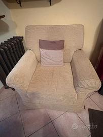 Vendo salotto completo composto da divano a 2 posti e 2 poltrone abbinate, rivestiti in tessuto chenille color beige/sabbia, stile classico e confortevole. Caratteristiche: - Divano a 2 posti con cuscini ampi e profondi, molto comodo e avvolgente - 2 poltrone abbinate, ideali per completare il salotto - Rivestimento in tessuto chenille beige/sabbia, morbido al tatto - Struttura solida e ben imbottita, ancora con ottimo supporto - Inclusi cuscini decorativi a righe bordeaux/beige Condizioni: tenuti in buono stato, normali segni del tempo ma nessun danno strutturale. Comodi e funzionali. Prezzi: - Set completo (divano + 2 poltrone): 500 euro trattabile - Solo divano: 150 euro trattabile - Solo poltrona: 100 euro cadauna trattabile Ritiro a Crescentino (VC). Carico a carico dell acquirente. Non spedisco. Disponibile per qualsiasi informazione!