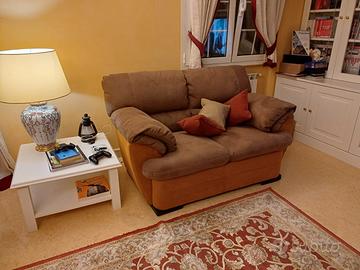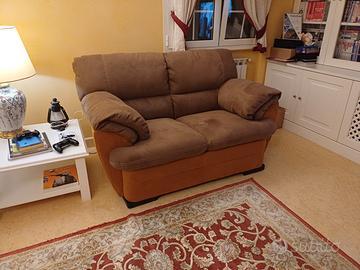 Vendesi per rinnovo arredamento divano a 2 posti, caratterizzato da un design accogliente e una seduta molto confortevole. Il divano presenta un elegante contrasto bicolore (marrone scuro e base arancio/terracotta) che si adatta perfettamente sia ad ambienti classici che moderni.