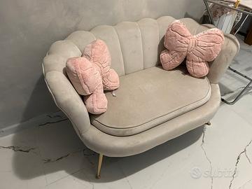 Divano 2 posti conchiglia in Velluto Tortora in buone condizioni,ha qualche lieve macchia dove si toglie con pulitore a vapore o prodotto smacchiatore.