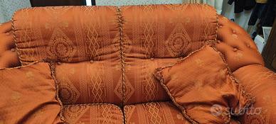 Vendo elegante divano 2 posti con poltrona e 3 cuscini abbinati, colore ruggine e oro per cambio arredamento, Il divano come la poltrona sono in ottime condizioni, manca solo qualche frangia in basso .