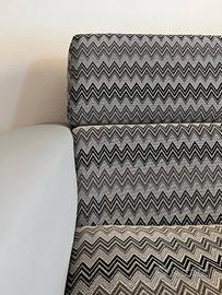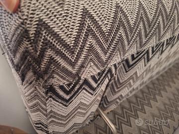 Cuscini in stoffa, testiera semi- reclinabili, struttura in legno, ruote per trasporto un pao arrugginite, ma perfettamente funzionanti colore grigio chiaro, cuscini fantasia Missoni bianco nero