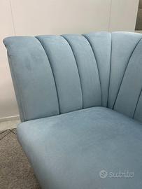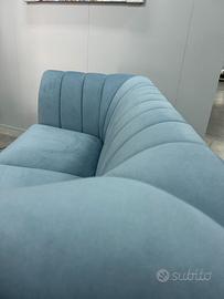Divano 2 posti fisso L.170 in pregiato tessuto vellutato colore carta da zucchero, con piedi a spillo colore nero. Si tratta di un prodotto nuovo da esposizione, ed è stato realizzato seguendo canoni artigianali, curando ogni minimo dettaglio.