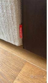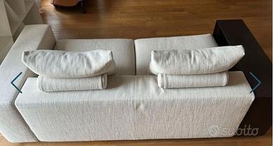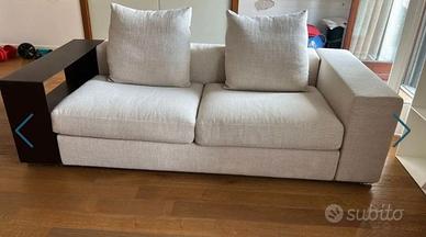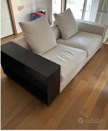 Divano 2 posti colore ecrù rivestimento in tessuto (cotone e lino) sfoderabile piedi in metallo con vernice epossidica. Tavolino con funzione di portaoggetti, struttura in metallo rivestito in cuoio color testa di moro