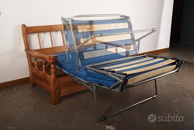 Poltrona letto in legno di pino massello. Divano 2 posti sfoderabile, fusto in pino massello e cuscinatura in poliuretano espanso con robusta rete ortopedica elettrosaldata, completa di un comodo materasso in espanso di spessore 7 cm. La densità della seduta è di 21 cm e lo schienale di 18 cm. Il rivestimento è completamente sfoderabile e lavabile. La particolare tornitura sui lati da alla poltrona letto uno stile country, rustico, perfetta per case in montagna, baite, taverne e mansarde. Misure: -Altezza 88 cm; -Larghezza 131 cm; -Profondità 90 cm aperto 230; -Spessore seduta 21 cm; -Spessore schienale 18 cm; Materasso: -Larghezza 90 cm; -Lunghezza aperto 180 cm; -Altezza 7 cm. Possibilità di acquisto di un tavolo e poltrona singola della stessa linea. Ritiro a carico dell'acquirente, prezzo trattabile.