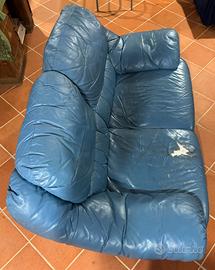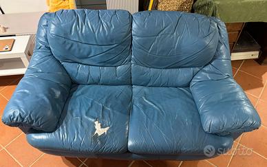 Divano in pelle 2 posti colore cobalto. Andrebbe ritapezzato in quanto la pelle é consumata e in alcuni punti mancante o strappata. Ho messo il copridivano