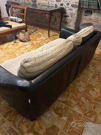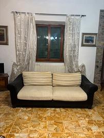 Vendo divano 2 posti con seduta ampia e molto confortevole. Struttura in pelle nera (braccioli e base) e cuscini in tessuto beige chiaro con motivo decorativo.