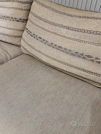 Vendo divano 2 posti con seduta ampia e molto confortevole. Struttura in pelle nera (braccioli e base) e cuscini in tessuto beige chiaro con motivo decorativo. In buone condizioni generali: i cuscini sono sfoderabili e facilmente lavabili. Perfetto per salotto, studio o casa vacanze.